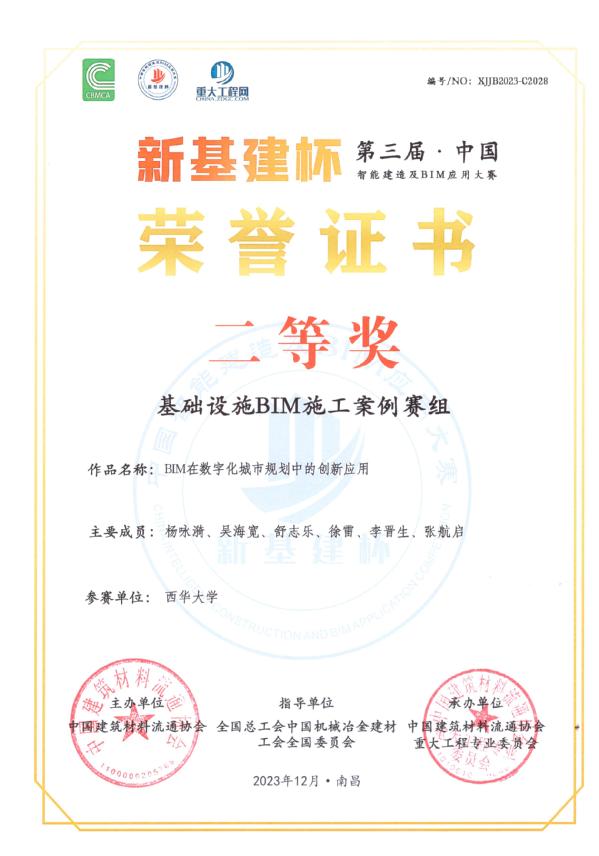 第三届“新基建杯”中国智能建造及BIM应用大赛由全国总工会中国机械冶金建材工会全国委员会指导,中国建筑材料流通协会主办,大赛以数字中国建设为引领、以技术创新为驱动、以数字建造为重点,面向高质量发展需要,提炼数字转型、智能升级、融合创新案例。团队作品“BIM在数字化城市规划中的创新应用”经过专家初审、复评、答辩等环节,最终从全国1286项作品中脱颖而出,荣获基础设施BIM施工案例赛组全国二等奖!