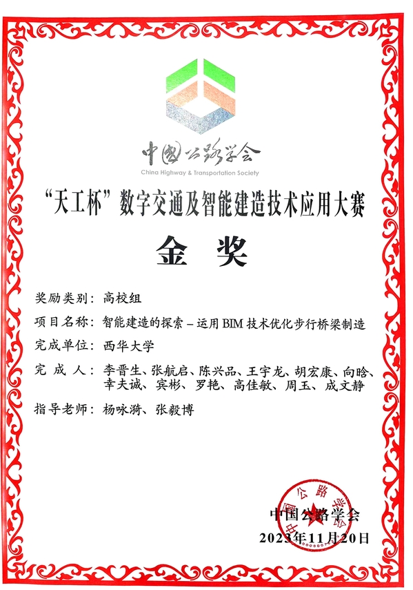 其中,“天工杯”数字交通及智能建造技术应用大赛由中国公路学会举办,参赛作品入围共计165项,历时半年,团队作品“智能建造的探索——运用BIM技术优化步行桥梁制造”经过两轮专家层层评选,最终荣获院校组全国唯一金奖!