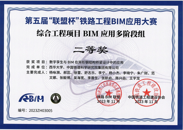 第五届“联盟杯”铁路工程BIM应用大赛由中国铁路工程建设协会主办,是铁路行业BIM应用权威推广、交流平台,该赛旨在推进铁路行业BIM技术应用向纵深发展,服务铁路行业数字化转型和产业升级,是国内铁路系统BIM领域的最高奖项。团队作品“数字孪生与BIM在异形钢结构桥梁设计中的应用”在指导教师组织下,参赛成员多次模拟答辩汇报,经反复修改,最终以高质量的成果、高水平的汇报在全国各勘察设计院所、央企总承包单位、软件公司、高等院校等110个入围项目中脱颖而出,荣获全国二等奖的佳绩!