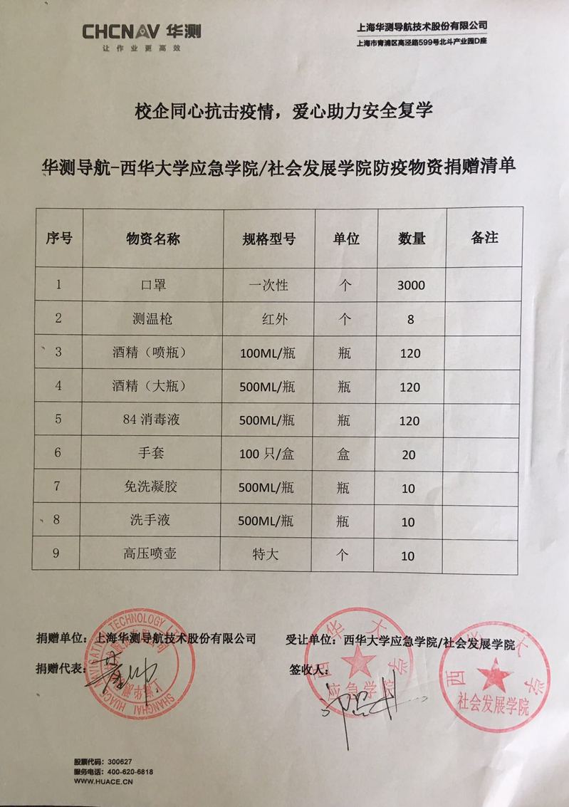 上海华测导航技术股份有限公司向应急学院/社会发展学院捐赠防疫物资