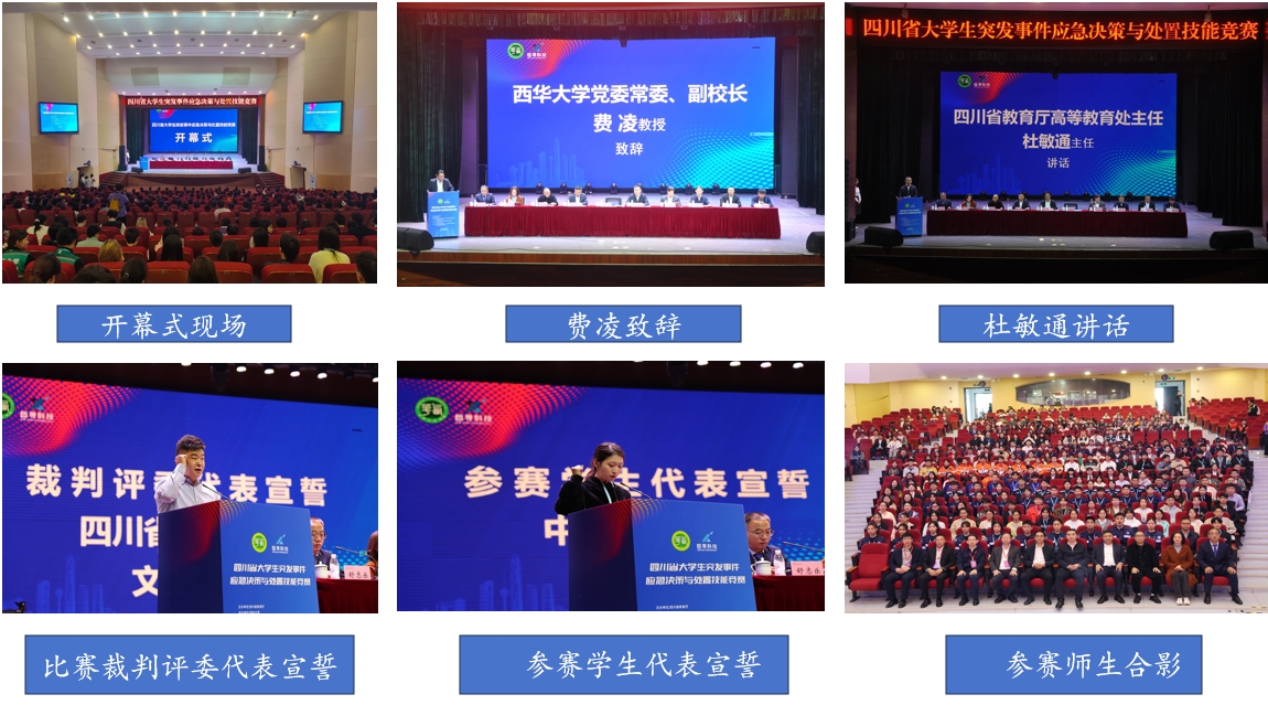 开幕式上,西华大学副校长费凌表示希望通过学科竞赛平台,加强全国应急管理专业的交流与合作,共同探索应急管理专业建设新模式和人才培养新途径。四川省教育厅高等教育处杜敏通主任在讲话中指出举办应急类学科竞赛对于激发同学们对应急管理学科的兴趣和热情,锻炼同学们在应对突发事件时的决策能力、组织协调能力和实际操作能力方面的重要现实意义。四川省红十字会文盖老师、中国矿业大学陈雨婷同学分别代表裁判和参赛学生进行宣誓。