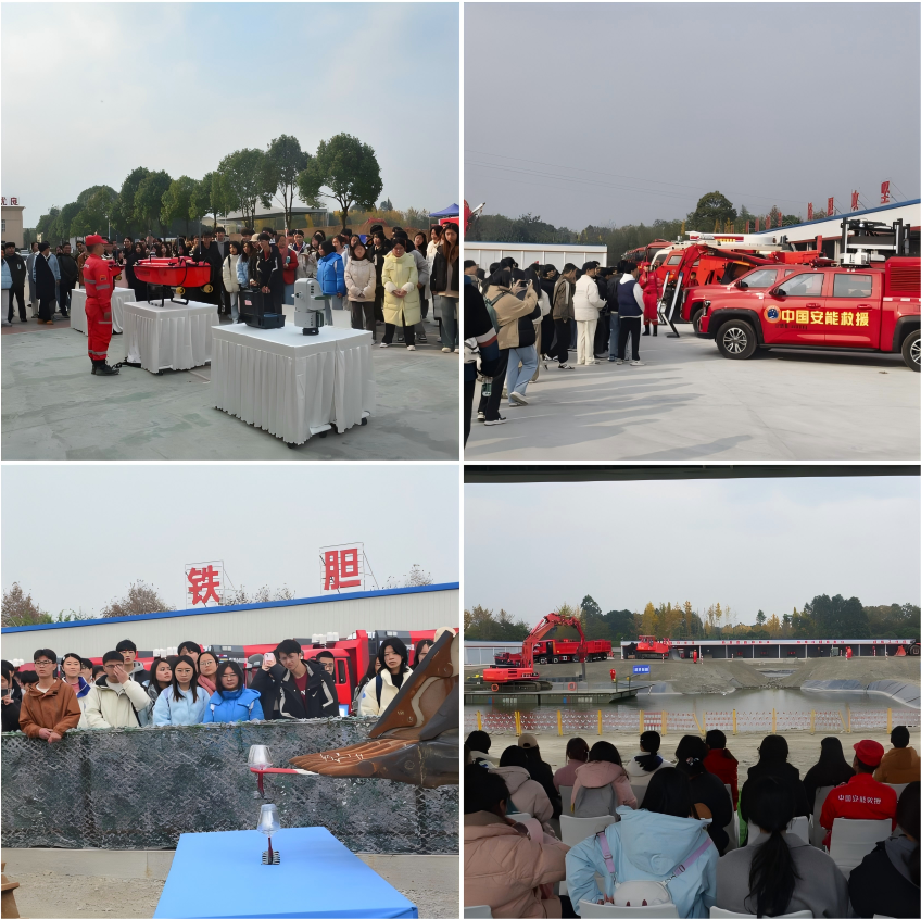 在中国安能集团第三工程局有限公司成都分公司,同学们首先观看了企业宣传片以及宣传展板,对安能集团“专常兼备,工程建设和应急救援并重”的企业定位有了深刻认知。讲解员为同学们介绍了水下探测仪、搭载激光雷达的无人机等一系列高精尖装备,工作人员现场展示了“穿针引线”“层层叠叠”“变形金刚”等项目,表现出应急救援人员在复杂环境下对设备力量的精准把控和沉稳的心态,从静态装备到动态科目,彰显了安能集团在应急救援领域的强大技术支撑。最后还展示了应急联合演训,模拟了灾情监测、堤防加固、决口封堵、路面清障、路桥架设、紧急排涝等实战场景,同学们直观了解了各设备实践运用以及各环节的运作流程与相互关联,在理论知识与实际操作贯通的同时,专业视野得到拓宽,有效提升了同学们对自然灾害工程救援实战的认知水平。