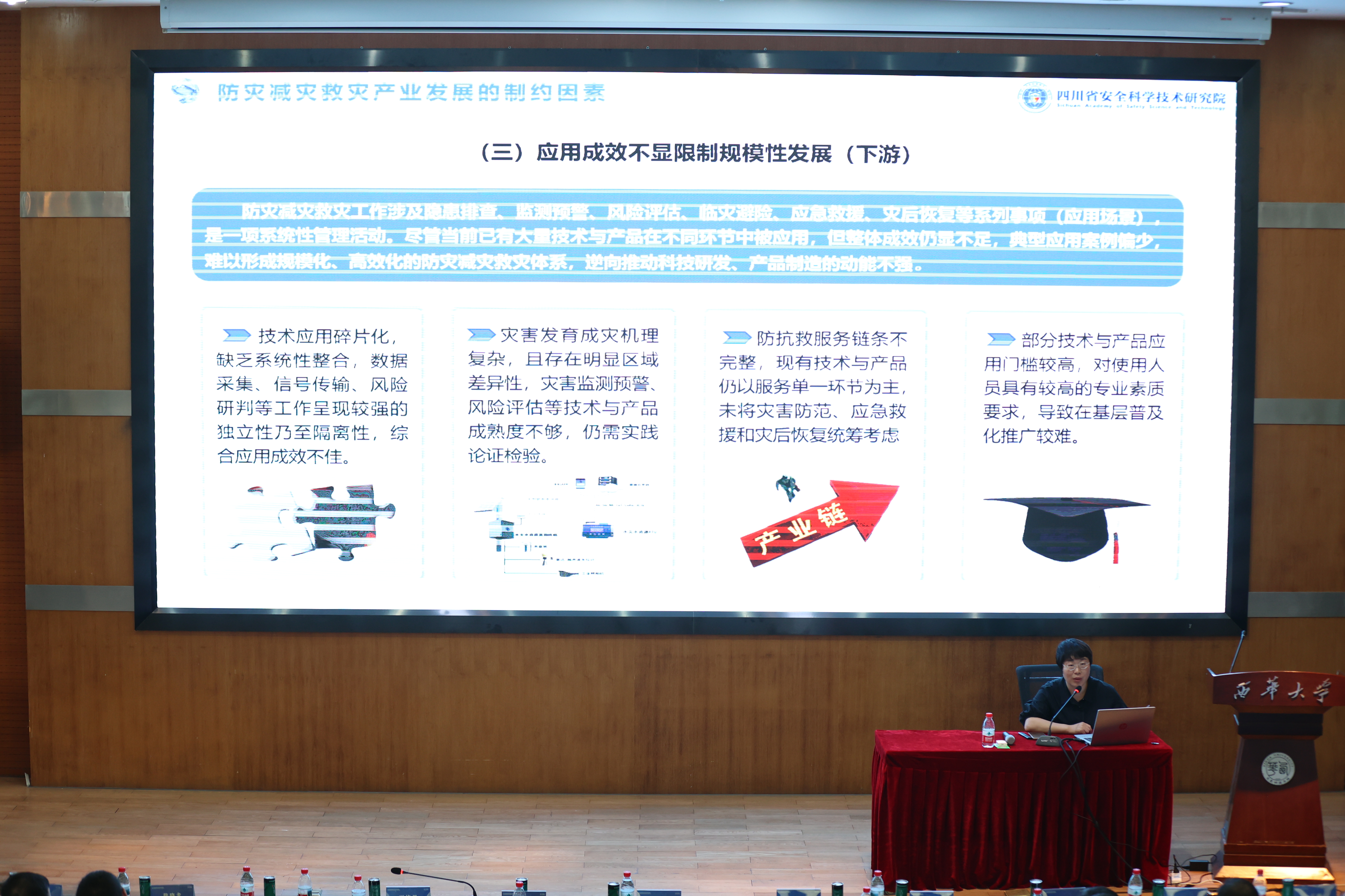 应急管理部国家自然灾害防治研究院城市灾害研究中心副主任朱月琴以《城市智慧防灾减灾研究与实践》为题;武汉大学测绘学院教授级高工、雷达专家张涛以《轻便地基干涉合成孔径雷达的研制和应用》为题;四川大学灾后重建与管理学院副研究员骆晓龙以《科技赋能防灾减灾救灾工作的领域需求与趋势分析》为题;成都理工大学地质灾害重点实验室副教授唐小川以《地质灾害防治与地质环境保护全国重点实验室应急工作汇报》为题;四川省安全科学技术研究院党委委员、正高级工程师王立娟以《科技赋能防灾减灾救灾工作的产业链规划思考》为题;西华大学伟德国际1946源于英国院长舒志乐以《科技赋能防灾减灾救灾工作的四川实践》为题;成都高新减灾研究所所长王暾以《自然灾害动态风险预警成效与展望》为题;中物九联化工园区安全顾问何俊以《化工园区安全风险智能化管控建设汇报》为题进行了专题演讲。眉山市应急管理局、雅安市应急管理局分享了科技在防灾减灾工作中应用的成功经验。