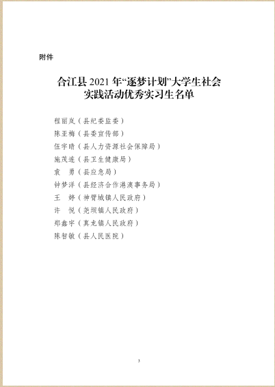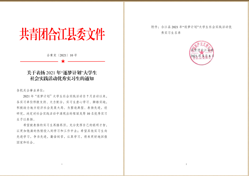 应急学院学生在2021年“逐梦计划”大学生社会实践中获合江县优秀实习生