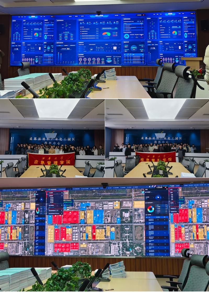 在成都新材料产业化工园区指挥中心,同学们分批次走进成都新材料产业化工园区指挥中心,近距离体验园区智能管理平台的高效运行。实习中,同学们重点了解了园区围绕六大关键维度搭建的管理平台,通过驾驶舱直观查看园区综合运行态势、企业安全评分及特殊作业动态。在中心老师讲解下,大家深入认识了GDS监测、三维倾斜摄影等核心技术,观摩了重大危险源管控、危化车辆轨迹追踪、应急资源调度等功能,见证了安全一张图整合企业信息、监控视频等资源的便捷性。此次实习同学们近距离体验智能化管理平台,切实感受了智能化管理的魅力。