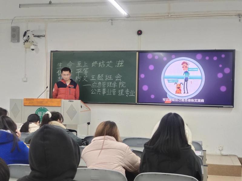 班会开始,辅导员李明玉老师对艾滋病和毒品的现状进行了详细的介绍并讲解了艾滋病的传播途径和预防艾滋病的方法,让大家更全面地了解艾滋病与毒品,并深知其危害。与此同时李明玉老师也呼吁同学们传递正能量,不要歧视艾滋病患者,撑起爱心大伞,为艾滋病人遮风挡雨。吴文懿班长为同学们播放有关艾滋病的视频,生动形象地向同学们传达了艾滋病的相关知识。