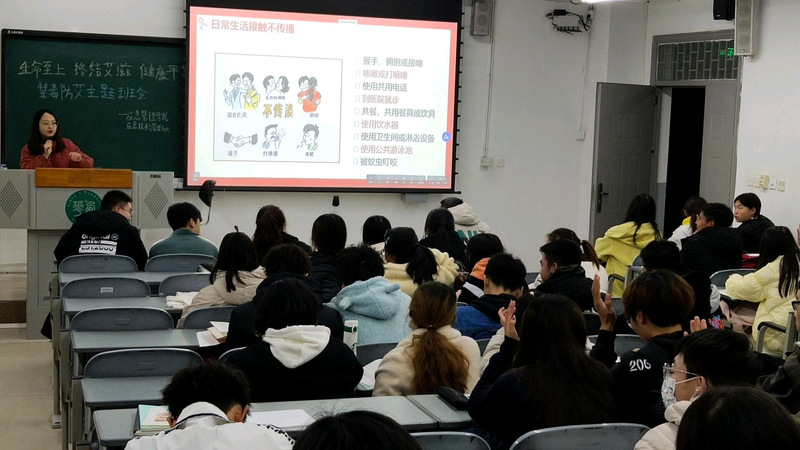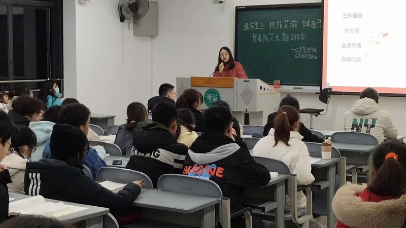 第一部分,由李明玉老师向同学们进行对艾滋病的有关讲解。通过讲解艾滋病的国内外现状、概念、传播方式、预防措施、灭活途径等多个方面来让同学们进行学习。李明玉老师指出:生命只有一次,我们每个人都应该懂得珍惜,要学会爱惜自我,保护他人,要做到远离艾滋。在我们面对艾滋病人群时,不应该对他们带有异样的眼光,而是应该学会正确的与他们相处。