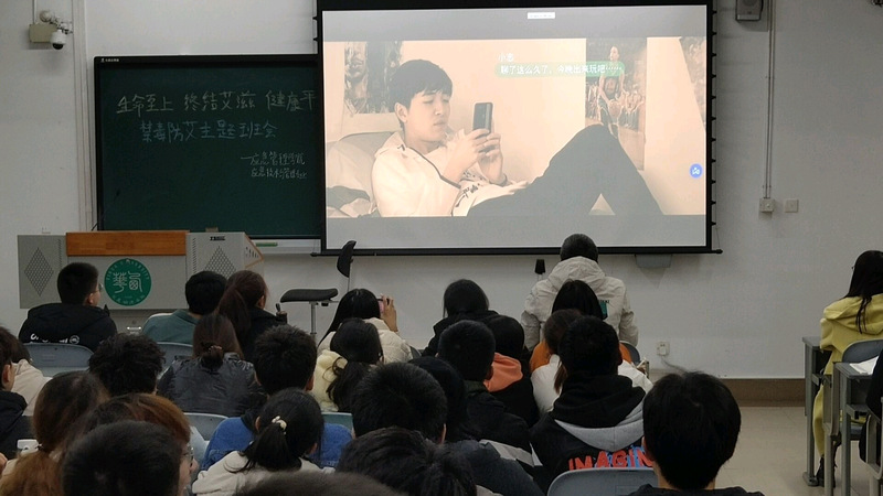 第二部分,由应急技术与管理1班的班长魏政播放相关视频。通过播放简洁明了的视频,让同学们们切身的感受到了艾滋病从感染到采取措施的一系列过程,从而增强了大家的防护意识。