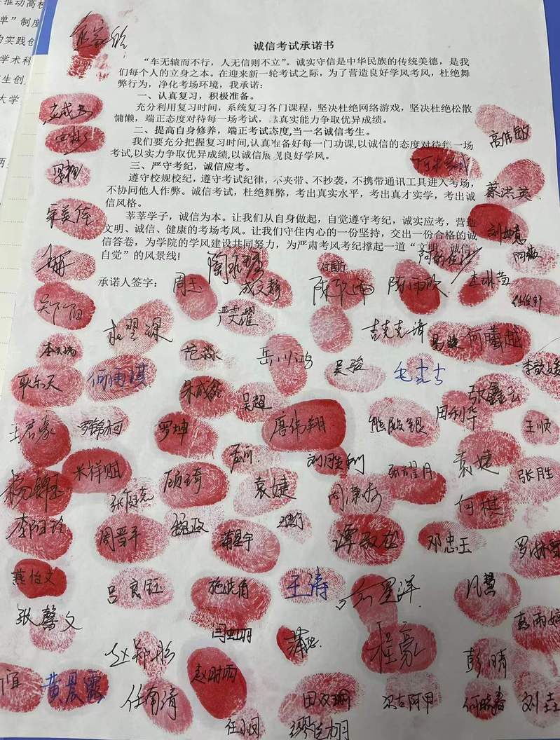 最后,为即将来临的四级考试顺利,同学们积极地在《诚信承诺书》上签字,表达了同学们诚信考试的决心和信心。