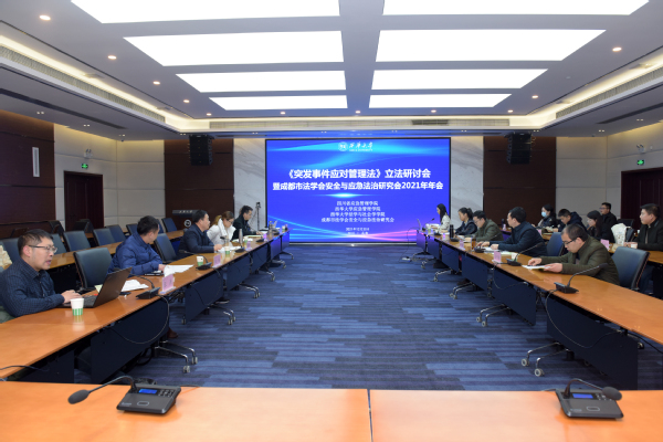 2021年12月30日下午,《突发事件应对管理法》立法研讨会暨成都市法学会安全与应急法治研究会2021年年会通过线上线下会议形式在西华大学行政楼101会议室举行。这是《突发事件应对管理法(草案)》提请十三届全国人大常委会第三十二次会议进行第一次审议后,国内较早就《突发事件应对管理法(草案)》进行研讨的专题学术会议。