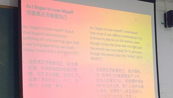 接着围绕本次主题心理委员田双瑜给大家分享了一首诗《As I Began to Love Myself(当我真正开始爱自己)》,希望大家能爱护身体、活出自我、笑对人生、追求精神和心灵的愉悦,更好地爱自己,只有学会爱自己才会更好地爱他人以及被他人所爱。