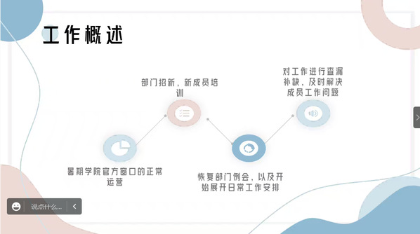 在主持人的组织下,团委学生会各部门正副部长按照顺序进行述职,分别陈述了个人工作总结与心得、主要工作成果展示、工作中存在的不足与缺点以及对未来的工作规划,并针对述职内容进行了答辩。主席团成员从评价搭档、沟通方法、未来工作中的创新方案等多角度提问、考察各述职学生干部,以进行更全面的总结与评价。