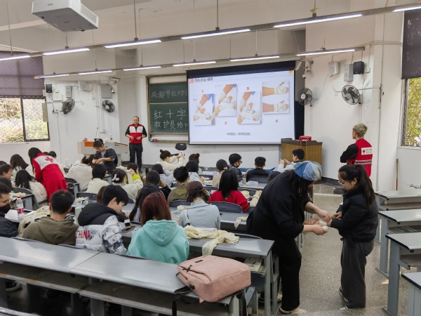 3月3日,四川省防灾减灾教育馆张玲、蔡靖、辛罡三位老师在6B102开展灾变环境下人员自救互救知识与技能培训的专题讲座。