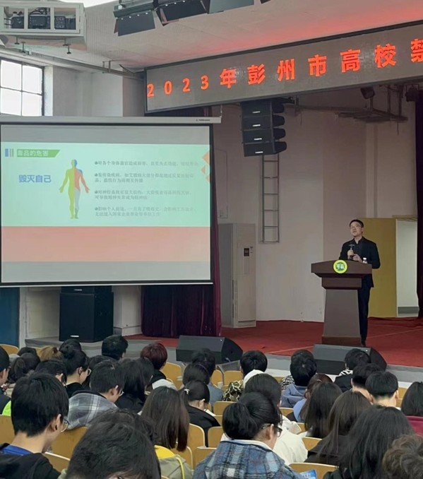 本次宣传活动中,陈诚老师通过讲述发生在彭州市的真实吸毒案例引起同学们对毒品危害的重视,并根据这些案例向同学们详细讲解了毒品种类以及毒品种类的发展;也通过向同学们讲解创新网络化污水监测、创新全覆盖毛发筛查监测、对社区戒毒社区康复人员管控机制、创新全领域禁种铲毒等禁毒工作,让同学们对现在的毒品发展情况有了一定的了解。